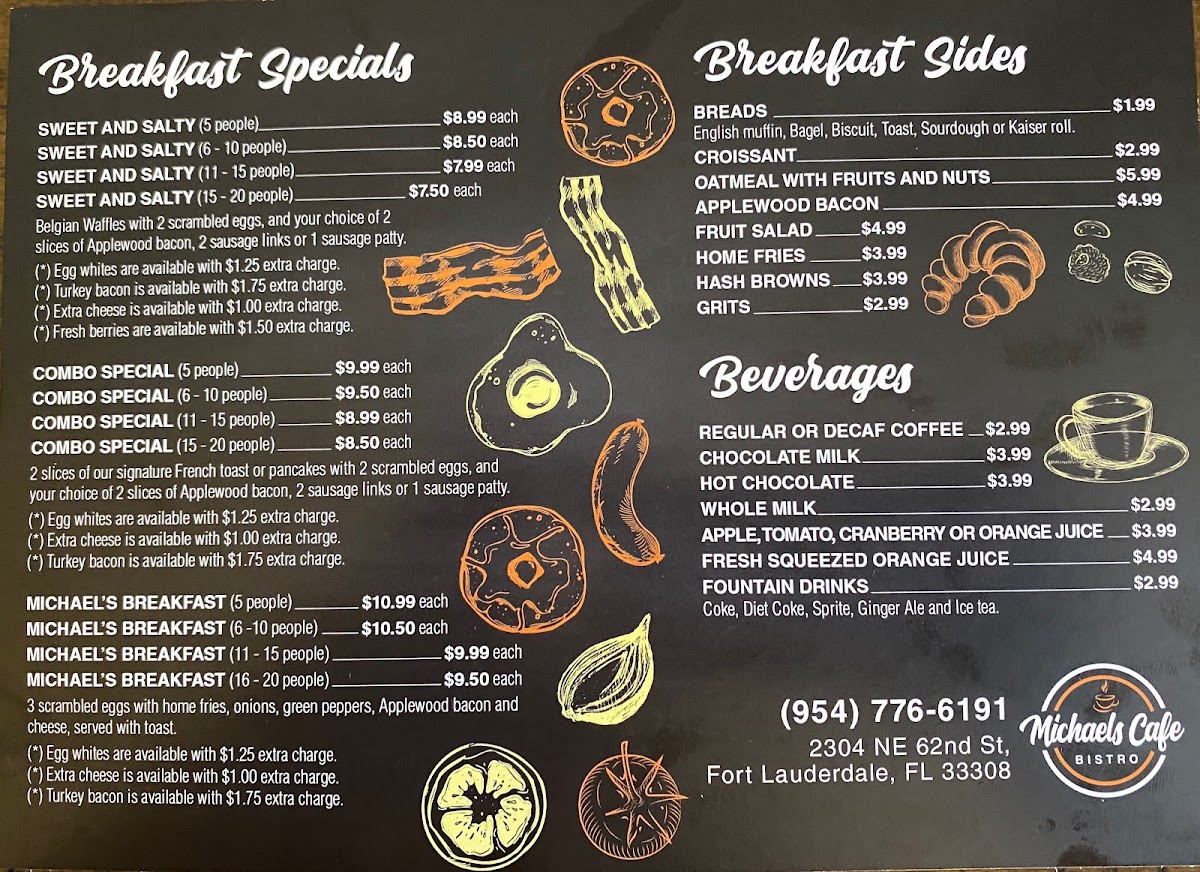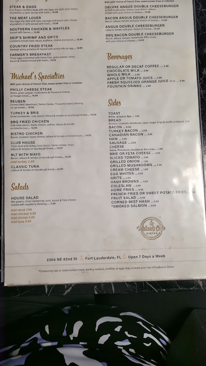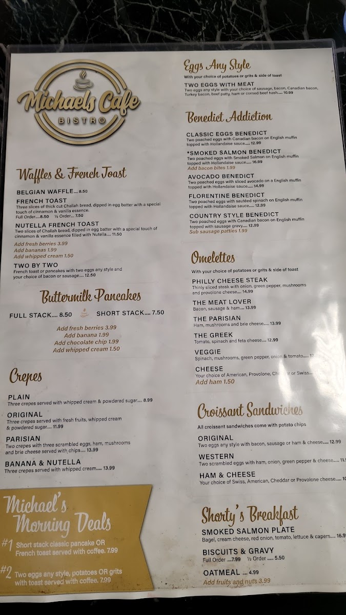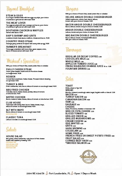 If you're in the mood for a cozy and inviting spot in Fort Lauderdale, look no further than Michael's Cafe Bistro Menu. Located at 2304 NE 62nd St, this neighborhood gem offers a mix of delicious comfort food with a modern twist. From hearty breakfasts to satisfying lunch and dinner options, there's something to please every palate. The menu features a variety of dishes, including fresh salads, mouthwatering sandwiches, and signature bistro-style entrees, all made with the finest ingredients.