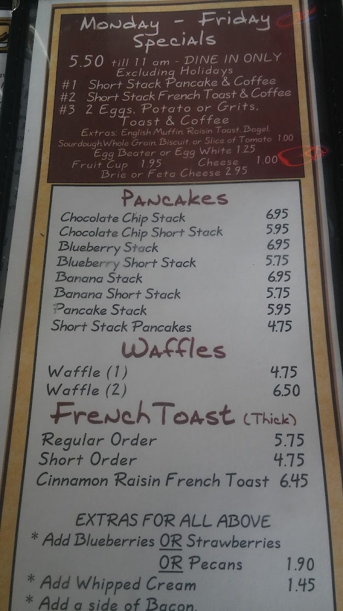 Two slices of our signature French toast or pancakes with two eggs any style, and your choice of two slices of bacon, or two sausages.