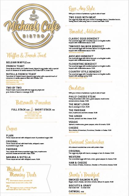 Whether you're stopping by for a quick bite or settling in for a relaxed meal, Michael's Cafe Bistro has a warm, welcoming vibe. The flavors are rich and satisfying, and the portions are perfect for any appetite. With a diverse selection of both classic and innovative choices, it's the kind of place you'll want to revisit again and again. So, next time you're in the area, make sure to check out what’s cooking at this charming spot!